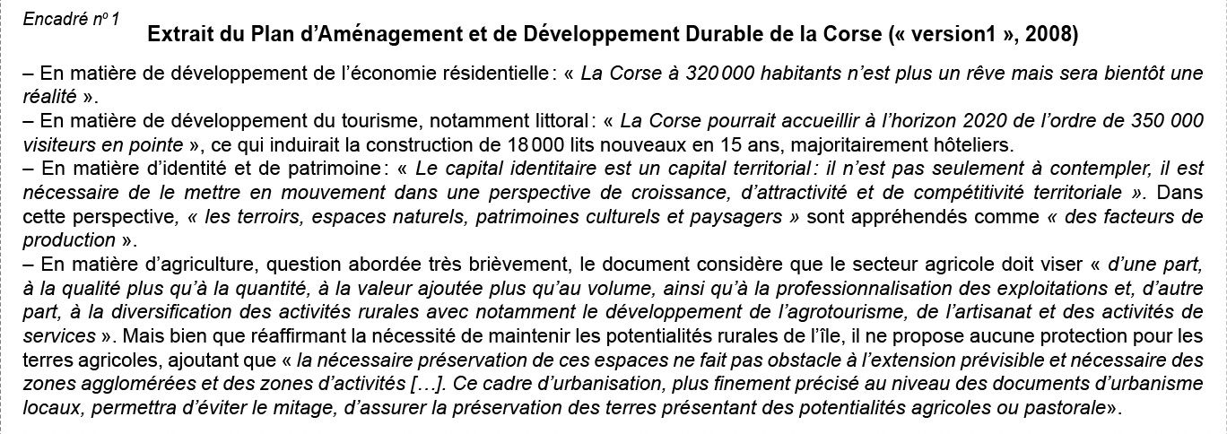 29C’est donc le choix d’un modèle de développement pour la Corse qui est interrogé au travers de la problématique du foncier agricole littoral.