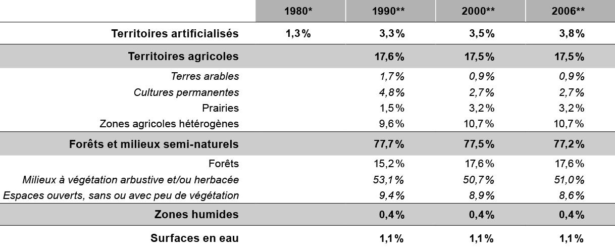 La nomenclature Corine Land Cover utilisée ici intègre les « milieux à végétation arbustive et/ou herbacée » au sein des espaces naturels.